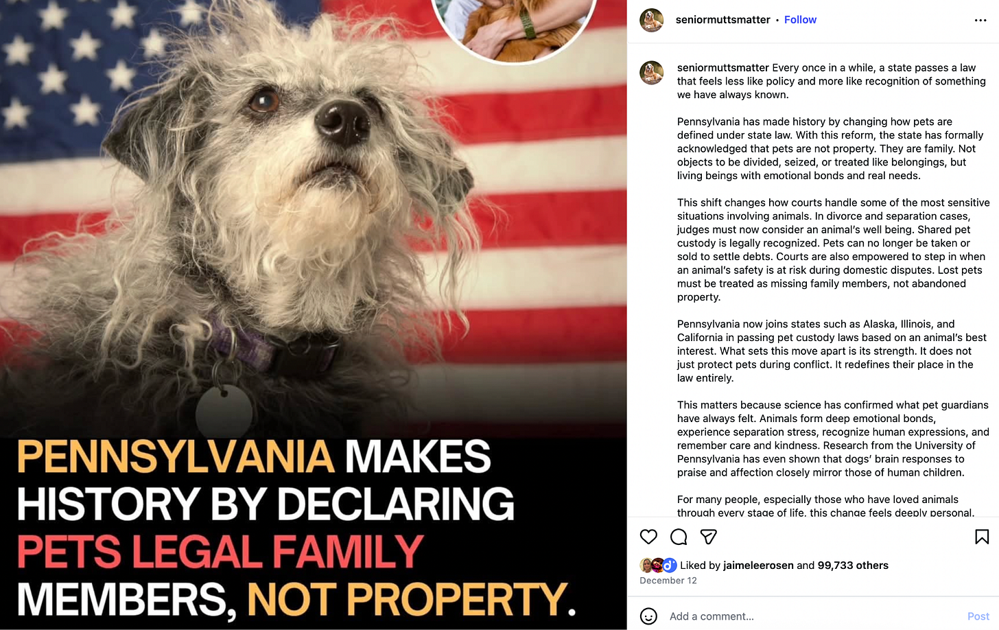 First, I was swept up by the social roar of an Instagram post from @seniormuttsmatter. The kind of post that racks up tens of thousands of shares because it says the thing so many people already feel but haven’t fully articulated yet. The message was simple, almost obvious: dogs aren’t “property.” They’re family.